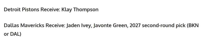 為此,美媒《fadeawayworld》也火速結(jié)合各支球隊(duì)的需求,以及克萊的爭(zhēng)冠渴望曬出5筆潛在交易方案,其中包括3換1赴湖人與東契奇重聚。